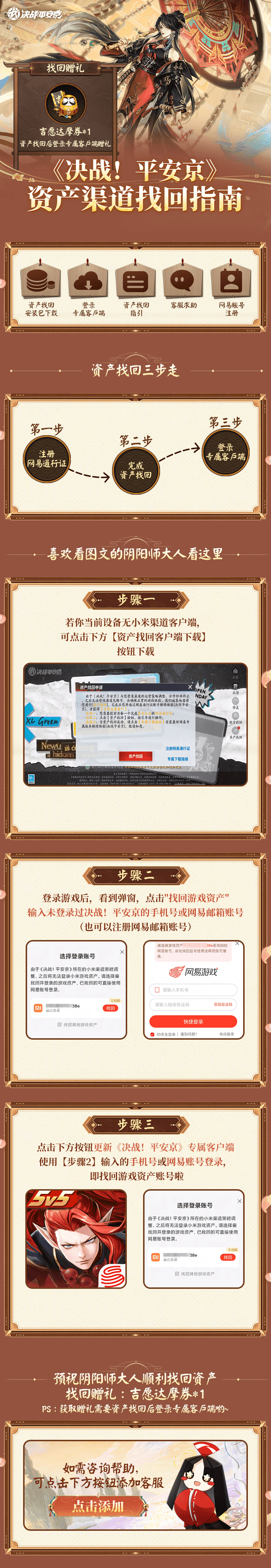 您可以根据操作指引完成角色资产找回,若在操作过程中遇到问题,可查看常见问题Q&A,或者前往网易大神APP,进入客服专区:https://s.163.com/sN1eDL,进行资产找回及获取更多指引信息。