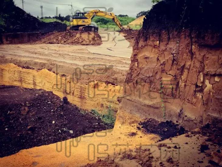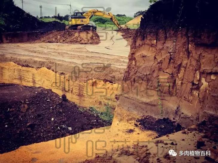 这是矿场的开采现场,大家看到上面红棕色的土层,就是赤玉土。下面黄色的土层,是鹿沼土。