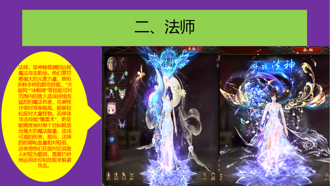 在游戏早期,法师凭借强大的群攻技能,在团战中发挥着重要作用,是团战收割者。但随着游戏发展,新职业相继出现,法师在PK和副本方面的优势不再明显,一度成为没落职业。后来法师一族觉醒,掌握了全新的元素类技能,重新在副本方面有了出色的表现,能与亡灵巫师比肩。