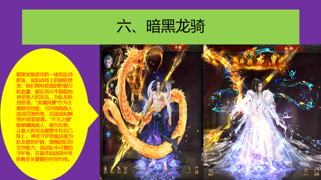 • 魔龙焚世:群体连击技能,不受控制,伤害能力强,移动速度快,但冷却时间过长,只能在关键时候清理小怪和控制对手。