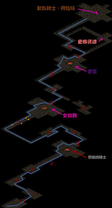 记住,我们是魔族!就算死,也要拉着你们一起死,卡利亚堡里面的怪都是死后会自爆的,杀了之后别忙着捡东西,先跑远点,不然被炸死后果自负!看下图:(蓝色线为走路路线)