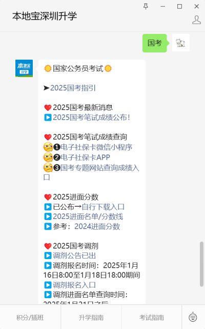 温馨提示:微信搜索并关注【本地宝深圳升学】公众号,对话框发送【国考】即可获取2025国考成绩查询+查询入口、进面名单+分数、调剂+面试公告等最新消息。