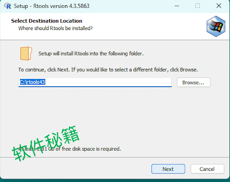2. 指定Rtools安装路径:建议与 R 语言安装到同一目录,如 “D:\Program Files\R\rtools43”,点击 “Next”。