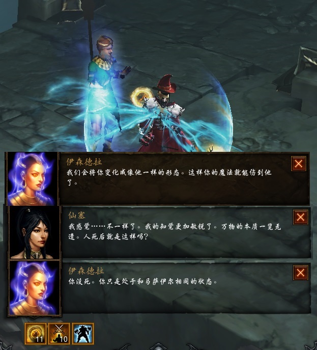 暗黑3在剧情方面做的非常棒,简直是精彩,在混沌界一、二层,14名英雄都会遇到他们各自的导师,对话都各有千秋和具有不同内涵,强烈建议大家都体验一番。伊森德拉强调了马萨伊尔的力量来源,也指出了这种灵魂的的死亡力量也可以转给奈非天,用以打败马萨伊尔并解脱自己的灵魂。