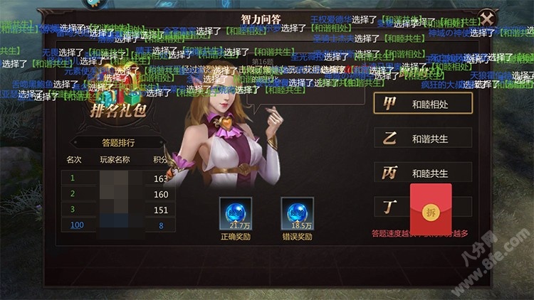 军团宴会是加入军团后可以参与的活动玩法,宴会活动开始后,将进行军团答题,军团中第一个答对的玩家将为军团增加答题积分。答题结束后,根据军团答题积分进行全服排名,排名前5的军团将获得军团红包,需要由军团长进行发放。答题可获得经验(成神后为神力)和战勋奖励。军团中第一个答对的玩家将额外获得战勋。