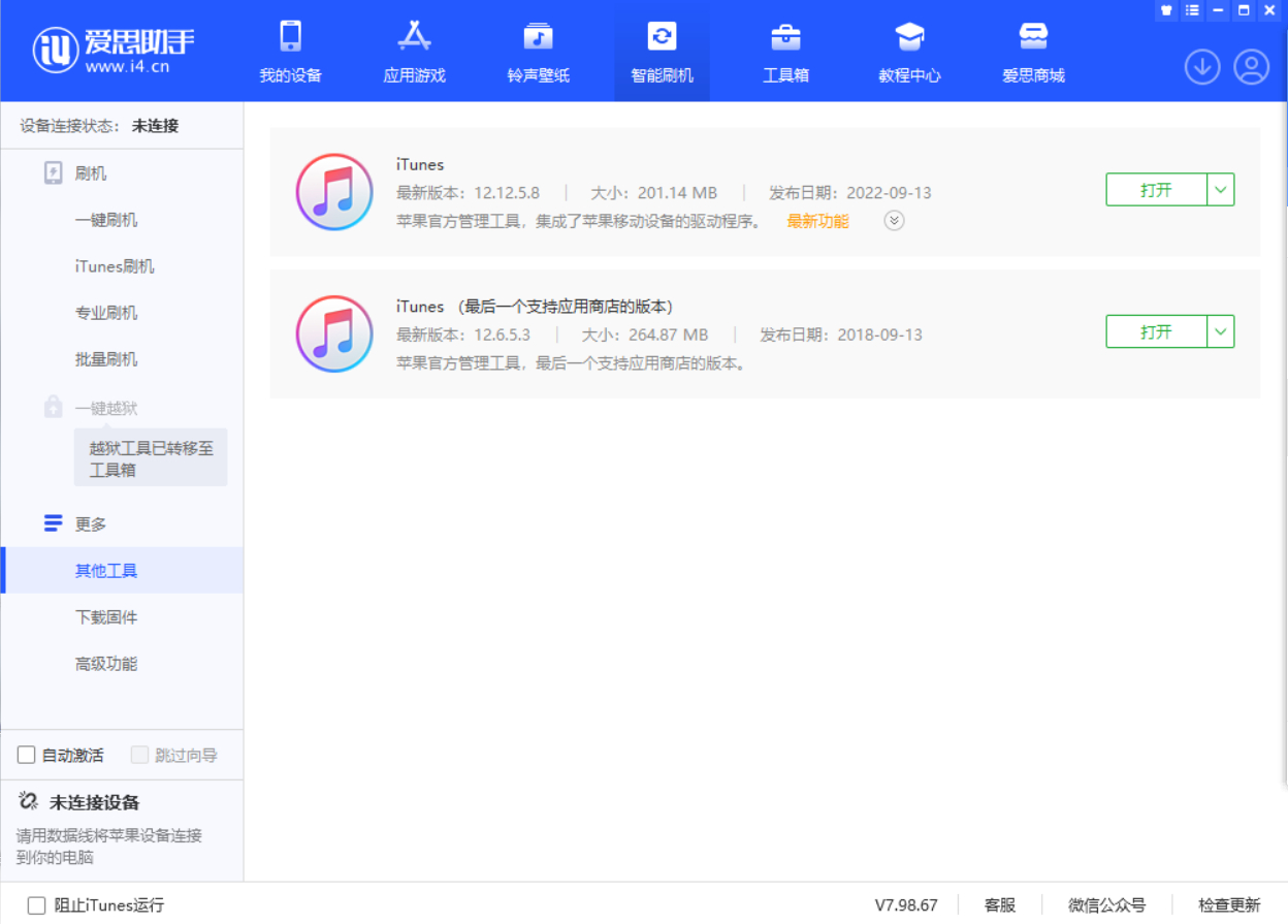 打开爱思助手后会自动下载最新版 iTunes,下载完成后不要安装,不然到时候还要先卸载新版再安装旧版,会麻烦许多。