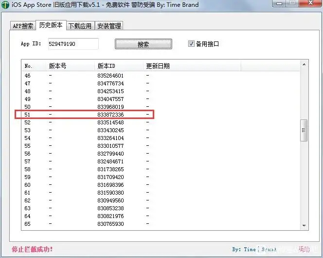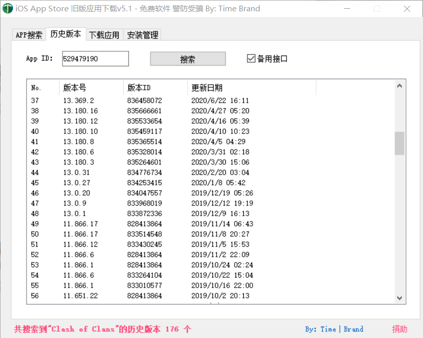 如果你无法搜索历史版本,并且下载安装包为 260MB,那怎么办呢?我们点击右下角进入作者说明,里面会告知无法搜索历史版本的应对方法,也就是手动选取版本 ID,我们按照下图所示操作即可。注:COC 13.0.1 版本的 ID 是 833872336.