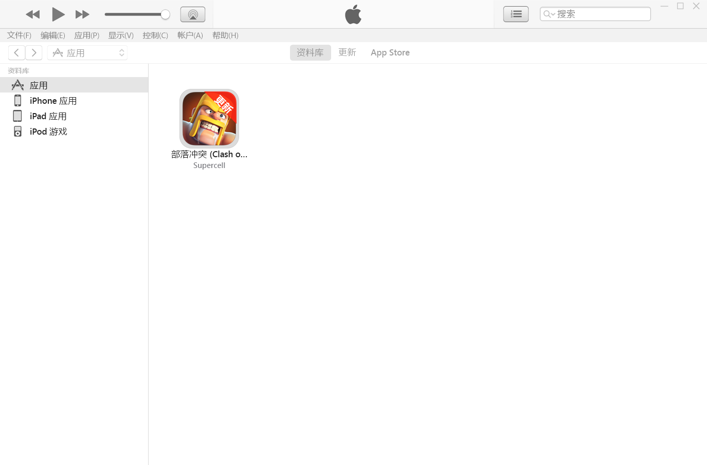 接下来我们进入 iTunes,左上角切换成应用,然后右上角搜索 coc 或部落冲突。