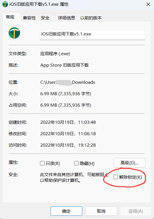 如果你不想每次运行程序都看到一个红色弹窗,那么你可以右键查看属性解除锁定。