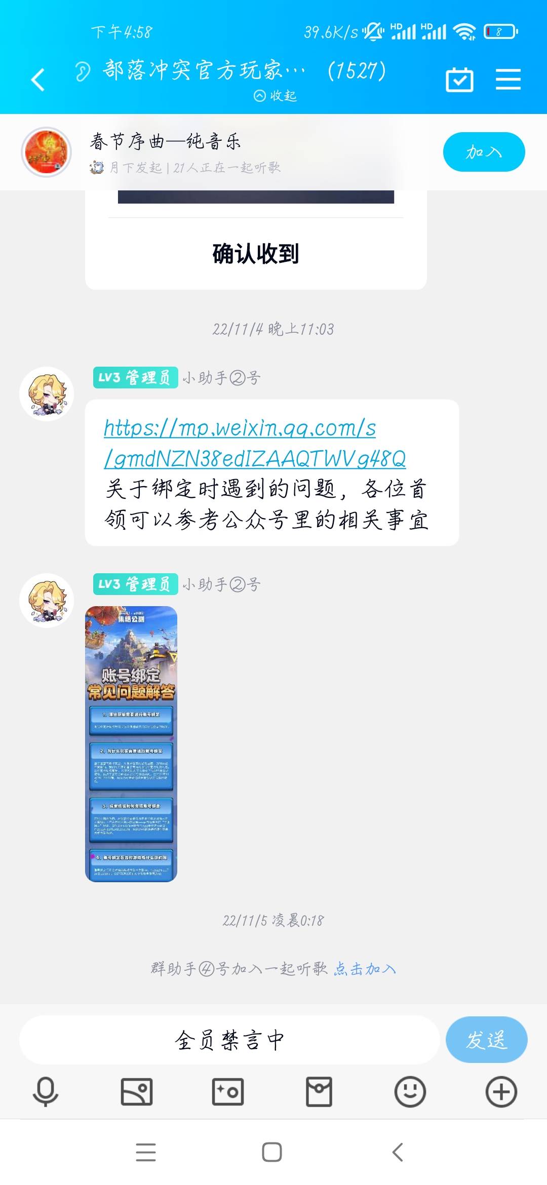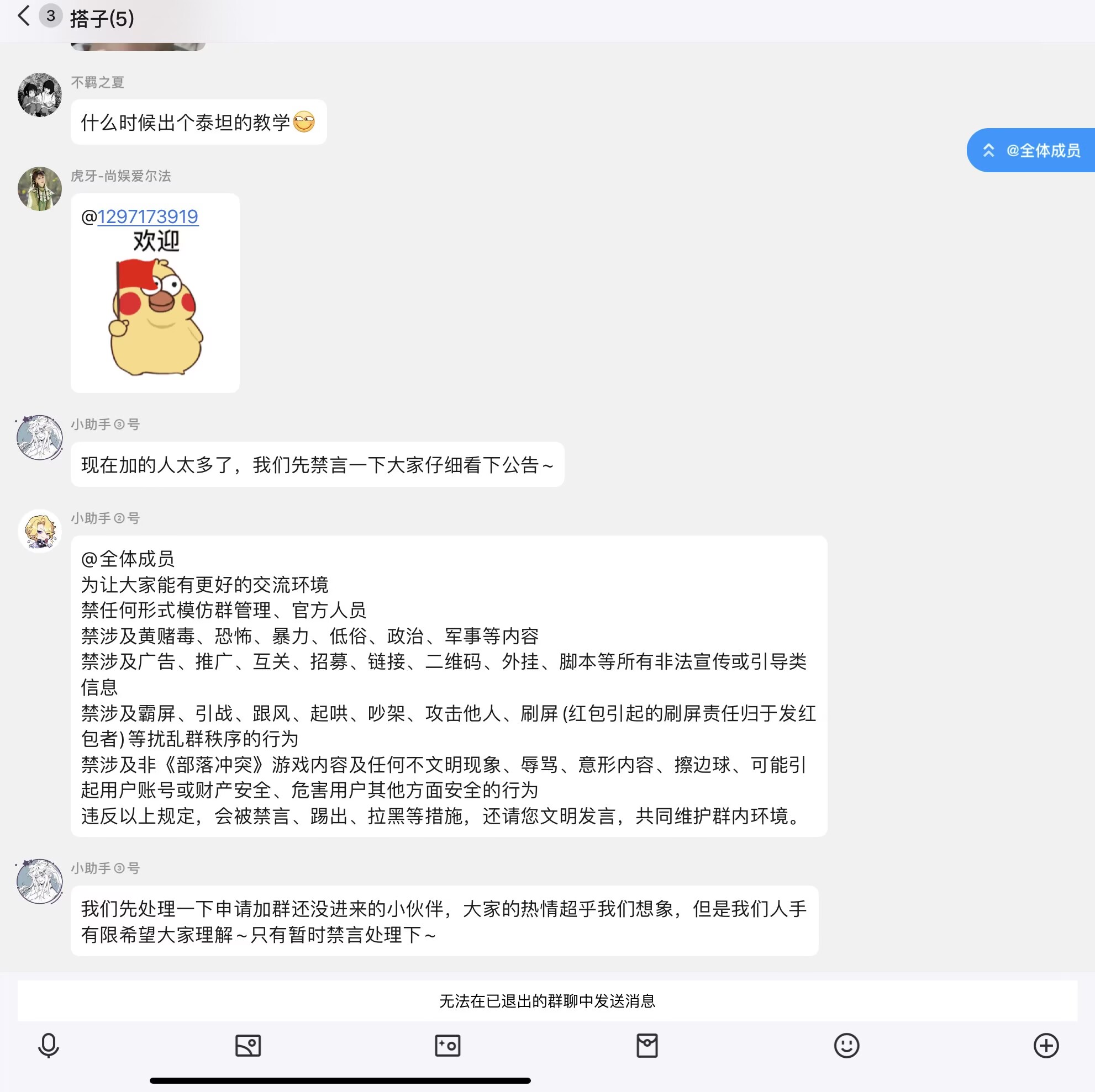 举个经典的例子,2022 年 10 月的时候官方曾经自己建了个群。那是啥时候啊?那可是国服的至暗时刻,好多人分服的时候没去国际服,却在这个时候去了。为什么呢?首先当时国服的版本已经落后国际服大半年了,国际服出了都城和 15 本,反观国服这边呢?除了不更新之外,还有屏蔽词一大堆、公告不能改(2023 年底才修复)、买杯现象严重(2025 年都未解决)、阵型不能复制(2023 年底才修复)、账号绑定(2023 年初基本解决)等一大堆问题。建群之后,玩家还以为官方总算愿意正面回应玩家诉求了,结果建群几个小时就全员禁言了。