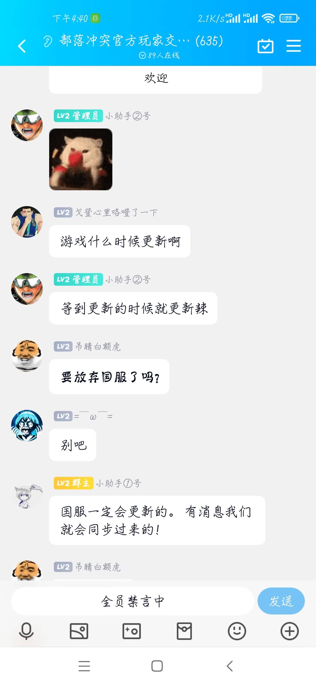 为什么要全员禁言呢?大概就是玩家们刷了几千条要求更新的消息吧……玩家诉求都这么明显了还不知道咋做吗?出来两个人说一下我们很重视玩家的需求,游戏一定会更新,我们现在遇到了什么困难,游戏现有的问题大概什么时候能解决,这一套下来就差不多了,结果官方是怎么做的呢?他们压根就没有正面回应玩家的诉求,还出现了名场面:等到更新的时候就更新辣。