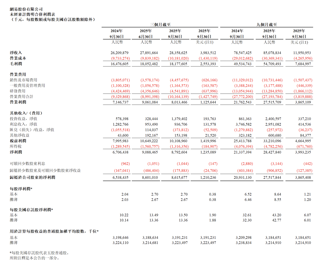 截至2025年9月30日,网易净现金(现金及现金等价物、流动及非流动定期存款和受限制现金以及短期投资余额,扣除短期和长期借款)余额为1532亿元,截至2024年12月31日为1315亿元。