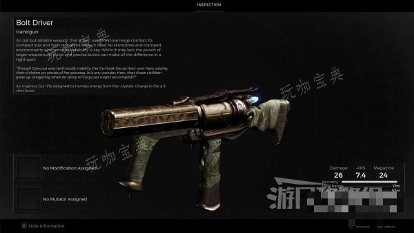 能量驱动属性:伤害26、每秒弹数7.4、弹匣24。理想范围17m、衰减范围52m、最大弹药量96、暴击几率10%、弱点伤害加成+105%、硬直改装-10%。