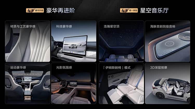 顶配Ultra+版再贵3万要31.98万,多出来的是智能感应门、星空顶、伊姆斯躺椅最大躺角125度、4向电动腿托这些。说实话这些配置偏向情绪价值,实用性不如Ultra版的双腔空悬来得直接。预算充足追求仪式感可以考虑,理性消费的话Ultra版是上限。
