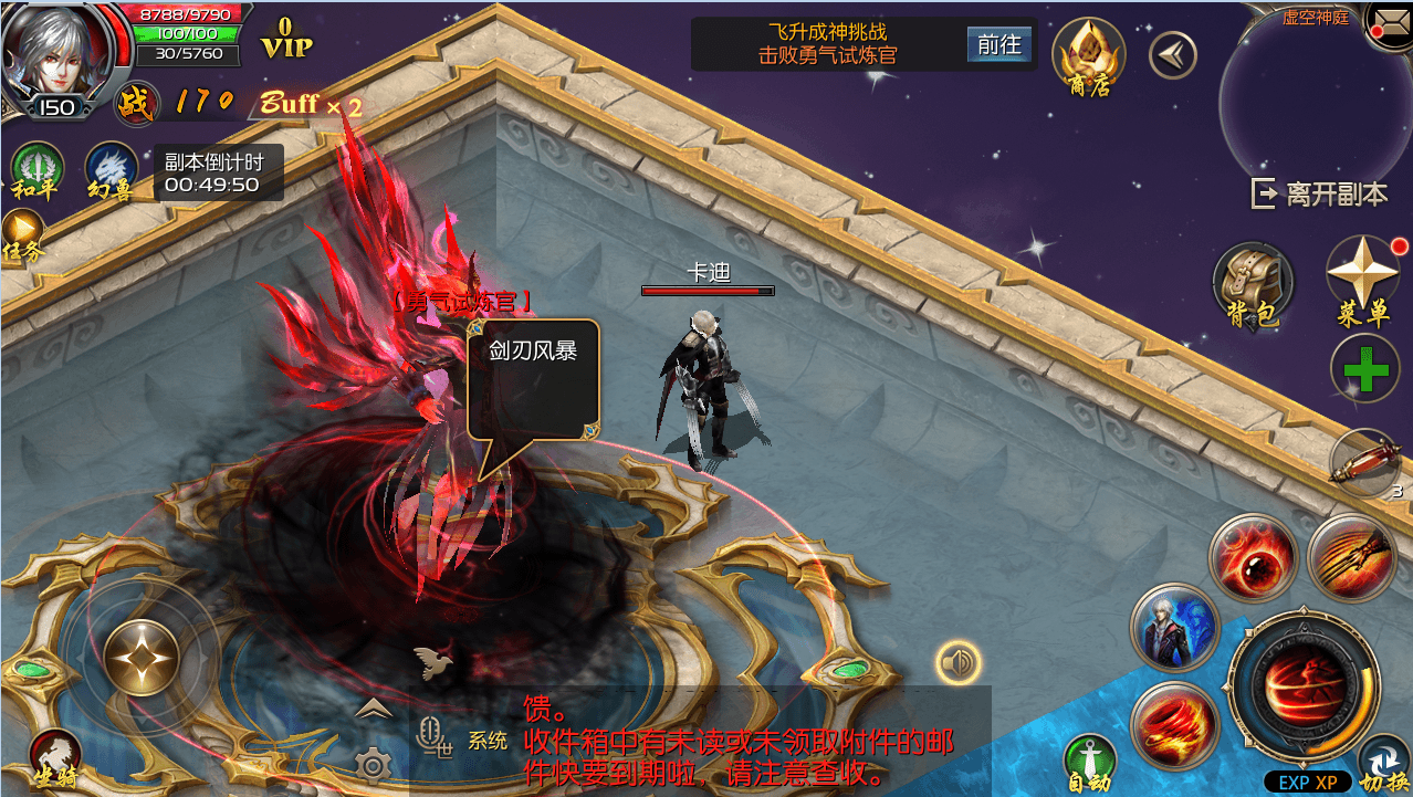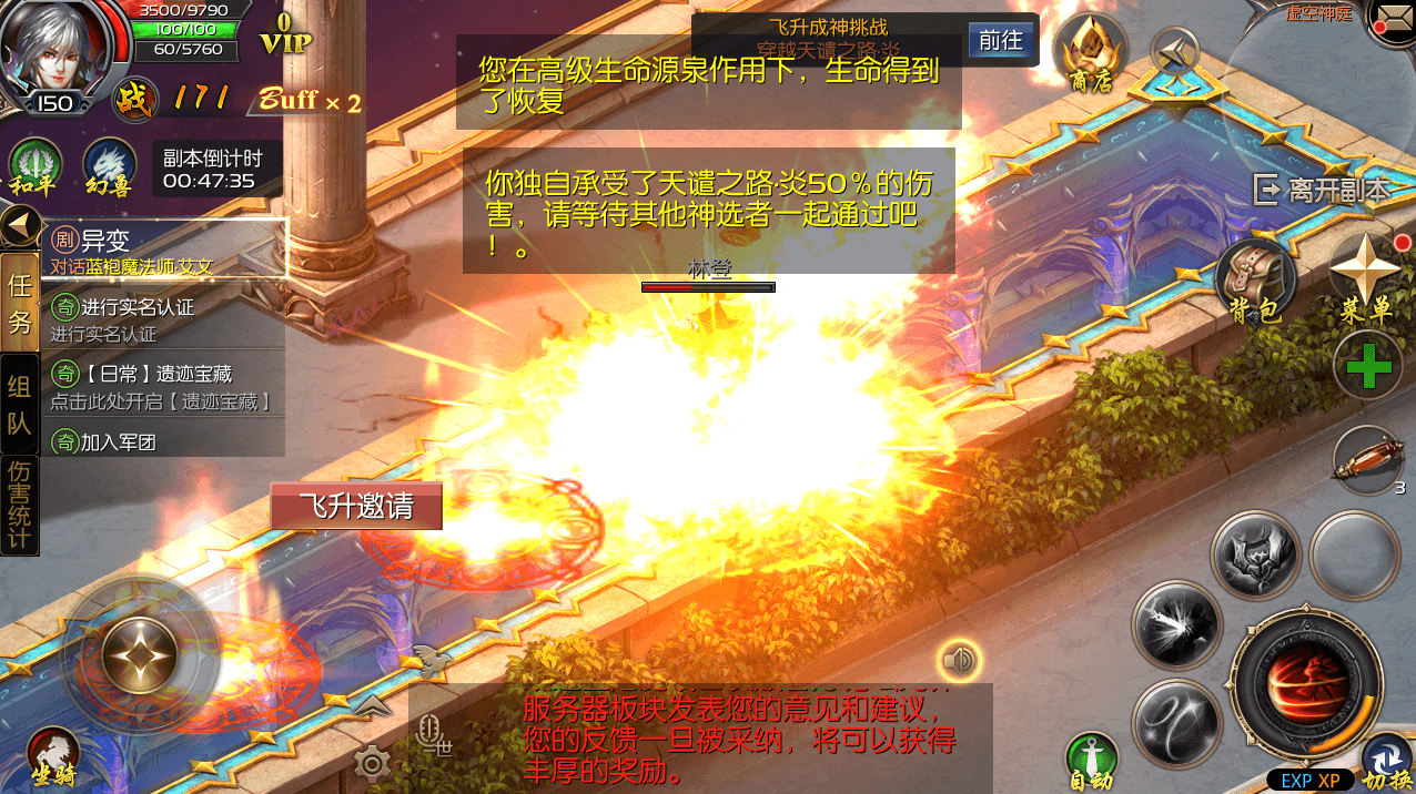 飞升挑战限时30分钟,超时则算作挑战失败,且飞升挑战途中遍布凶险,步步危机,请携带足够的生命恢复类药剂!