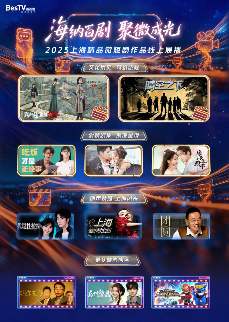 当天,百视通IPTV、互联网电视、有线电视、视频号等全媒体矩阵全程直播“2025上海精品微短剧产业促进大会”,并同步上线“2025上海精品微短剧作品线上展播”专区。未来一个月内,由SMG互联网节目中心匠心打造的文旅微短剧《跟着唐诗去旅行 第一季:我和诗圣做搭子》、由百视通甄选的《晴空之下》《杀手甜妻摊牌了》《缘来是殿下》等微短剧作品将集中上线,并通过百视通平台覆盖全国1.8亿家庭用户,打破微短剧的受众圈层,让优质内容从“小屏狂欢”走向“大众视野”,进一步提升微短剧作为新兴文化产品的社会影响力与主流认可度。