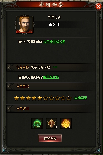 当玩家加入军团后,就可以接取军团任务了。军团任务每日可完成10次。完成军团任务可以获得军团金币和战勋值,战勋值可以用来购买军团内战勋商店的道具。