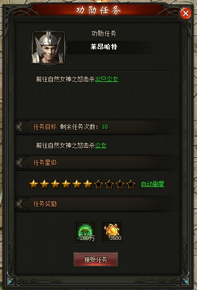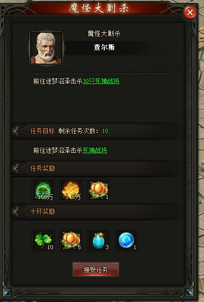 玩家每日可接取魔怪大剿杀任务。魔怪大剿杀任务共有10环,当做完全部10环任务后还会有额外的十环奖励。