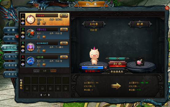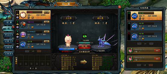 幻兽可以通过幻化来提升幻兽的星级。幻兽可以通过消耗和自己同种族的幻兽或者O型幻兽来进行幻化。如果幻化中使用了幸运草,即可获得最大的成长属性。幻兽每次幻化都会消耗一定的精力值。精力值可以通过使用精力果补充或者在线自动恢复。另外,值得一提的是,当幻兽在幻化至50星时,副幻兽的相性必须与主幻兽相同。玩家可以使用奇异果来改变幻兽的相性。如果主幻兽使用了电浆药水,即可将幻兽的相性变为雷属性,雷属性的幻兽在幻化时就不需要副幻兽有相性要求啦!大大节省了我们的操作。
