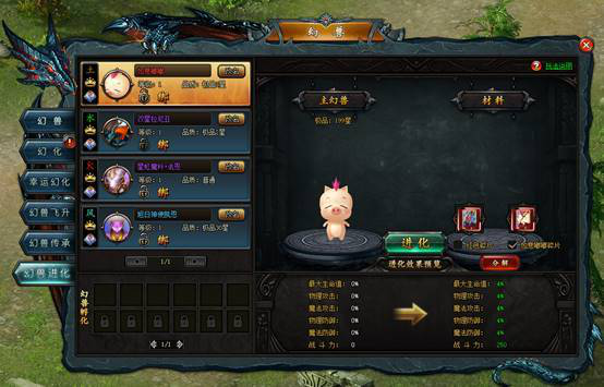 除了幻化、飞升外,玩家还可以通过幻兽进化来提高宝宝的属性。幻兽可以消耗幻兽碎片进行进化。幻兽碎片分为品质通用碎片和幻兽专属碎片。使用其中任意一种即可进行幻兽幻化。幻兽碎片可以通过分解幻兽或活动获得。每个幻兽最多可以进化10次。不过别担心,幻兽在分解后会返还进化过程中消耗的所有的碎片,可以放心培养自己喜欢的幻兽!
