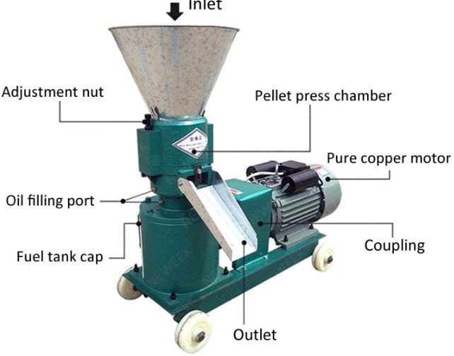 يمكن لآلة الحبيبات المسطحة أن تقوم بإنتاج جميع أنواع مواد الكتلة الحيوية ، مثل: البرسيم ، العشب ، التبن ، الحبوب ، الفاصوليا وغيرها من المحاصيل لتكون علف حبيبات صغير للحيوانات مثل الأسماك ، الجمبري ، الدجاج ، الأرانب ، الخيول ، الماعز ، إلخ.
