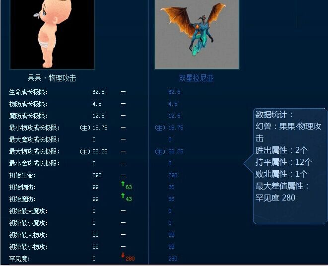 从对比上来看,双星的属性VS子女来说,子女胜出2个,持平12个,败北一个,总体来说,还在子女的属性略胜一筹,初始物防,初始魔防要比双星的高。而对于我们玩家来说,咱们选择哪种宝宝更适合自己呢?下面来详细分析下。