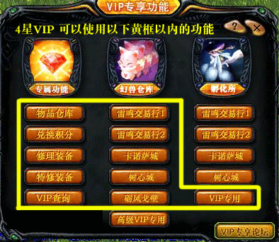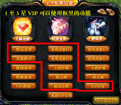 1到6星VIP(7星功能同6星),每个星级的VIP功能都不一样,当然星级越高功能也就越多,在游戏及游戏外所享受的功能及服务也都不一样。
