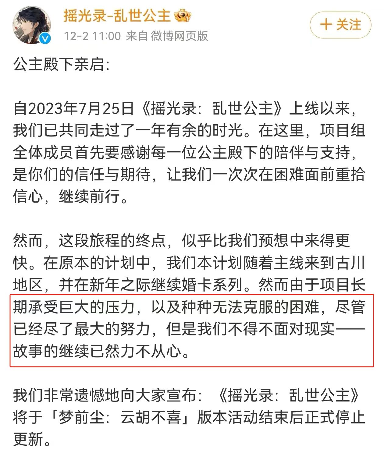 2024年12月2日,《摇光录:乱世公主》手游官方微博“摇光录-乱世公主”发布停止更新公告,称“我们非常遗憾地向大家宣布:《摇光录:乱世公主》将于‘梦前尘:云胡不喜’版本活动结束后正式停止更新。”公告发布后引发热议,该条微博下评论数过万,有网友留言:“我充的年卡,月卡都充满级了,怎么办?”