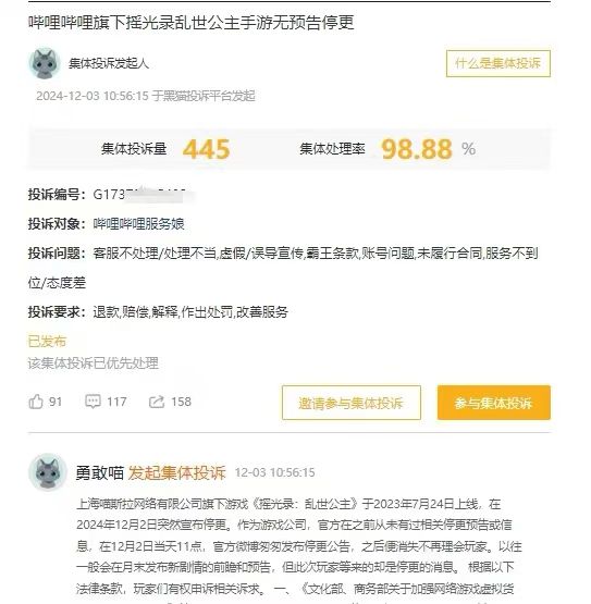 记者在黑猫投诉平台查询,看到截至2024年12月底,涉及该游戏停更的投诉共有445起。投诉内容多为消费者不满游戏突然宣布停更,认为虚拟财产也是财产,要求运营方尊重消费者意愿,不得损害消费者合法权益。
