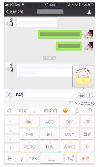 场景二:在输入框输入常见表情的字词时,直接弹出表情目前输入一些常见表情(如666,么么哒等)的字词后,如果用户下载的表情里面有同义表情的话会显示(如下图所示),如果没有则不显示,因此可以考虑对于一些常见表情,用户输入文字后,也能唤起相关表情的出现,这里面下载的表情可以增加权重,优先显示,若无,则显示未下载的同义表情。