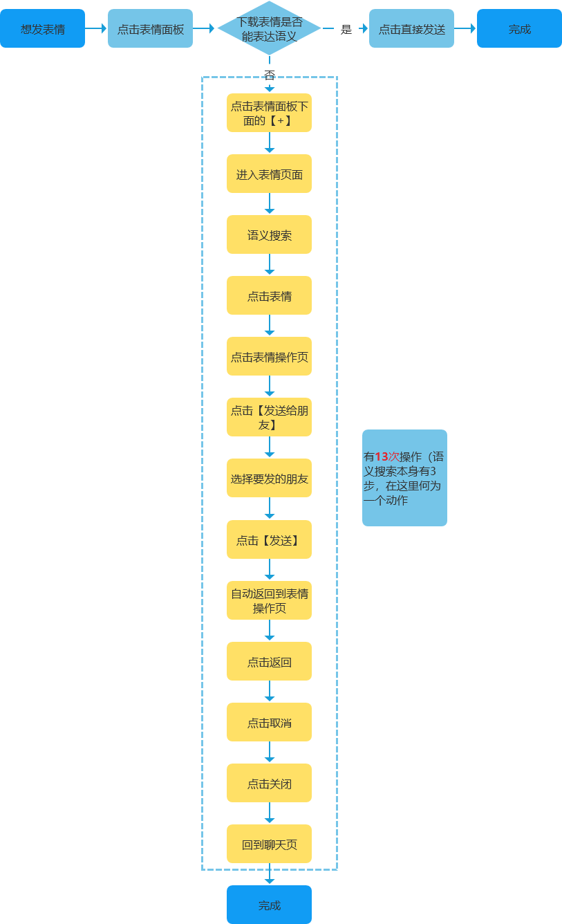 不知道大家在使用微信表情的时候,有没有遇到和我一样的问题——即无论我下了多少表情,总是有时候找不到适合发的表情,这个时候通常需要我进入表情页搜索相关表情再发送,整个流程十分长,其过程主流程见下图橙黄部分。可以看出通过搜索发送表情到聊天界面到回到这个界面继续聊需要13次操作,整个过程我是很崩溃的。