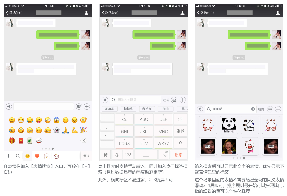 微信用户的表情包,个人感觉主要来源三方面:1.微信表情库自带的;2.用户下载到本地的;3.用户收藏的。对于用户下载本地的,KANYUSEKII前辈已经指出,用户已经习惯于“+”的操作;对于微信表情库自带的,微信目前已实现输入关键词显示表情以及搜索两种方式;而对于用户收藏的表情,微信目前貌似还未涉及。