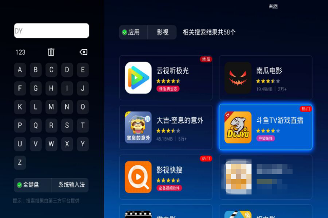 安装成功当贝应用市场之后,搜索“DY”下载运行即可。