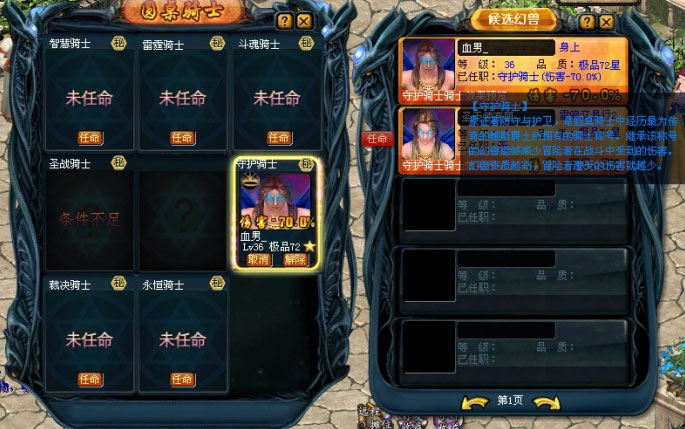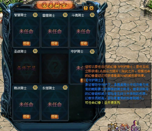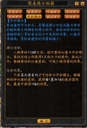 任命“守护骑士”后,能马上获得1点战斗力提升;除此之外,根据任命的幻兽星级还可获得最高70%的减伤害效果。