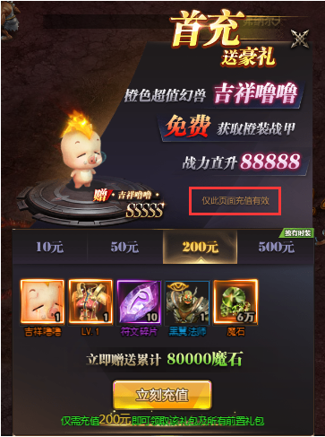 A:需要点击游戏界面左侧的首充按钮,只有在这个界面充值才会获得首充奖励,最高的500元那一档是累计获取80W魔石,即充值500元,可以获取所有4档的奖励,4档加在一起就是累计80W魔石了。