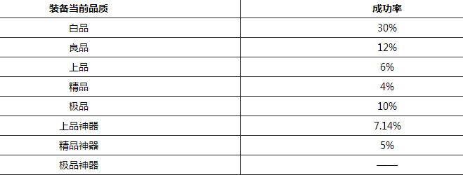 使用“灵魂王”提升装备品质的概率为100%,使用“灵魂晶石”提升装备品质的概率如下: