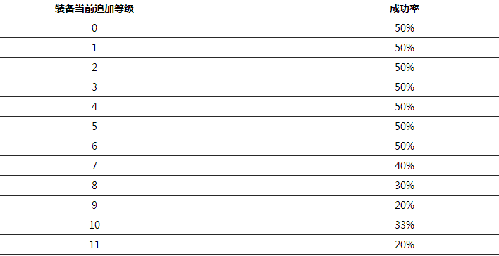 若装备类型为:头盔、盔甲时,等级升级概率根据等级由低到高的概率分别为100%、50%、35%、25%、20%、15%、8%;