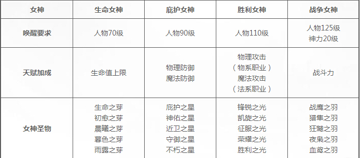 唤醒女神需要达到各项条件以及可获得的属性加成详细如下: