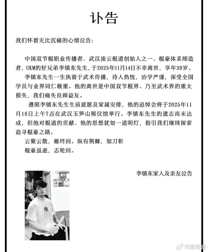关于李镇东的离世,讣告虽未明确说明死因,但知情人士透露的细节令人惋惜。近期,他正全力打造 "棍豪体系",长期处于不分昼夜的高强度工作状态,常练棍至凌晨一两点,休息严重不足。上周,他曾出现咳嗽症状,好友劝其休息时,他仅归因于 "烟抽多了",并未重视。最终,长期超负荷劳累诱发心肌梗塞,让这位正值盛年的武术大师遗憾离世。