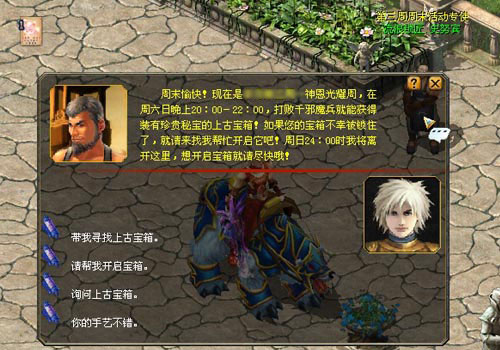 2.周六晚上20:00-22:00时,消灭千邪魔兵可获得各种上古宝箱。