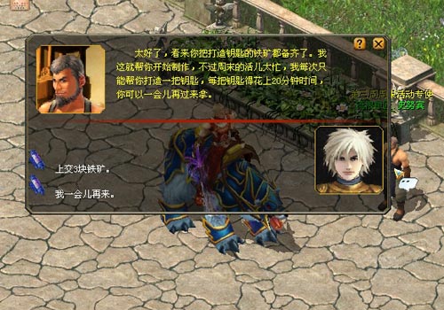 3. 在周日24:00之前,请各大主城中的流浪锁匠帮你打造开启宝箱的钥匙,根据锁匠的要求,采集三块对应材料的矿石。4. 将矿石将给锁匠,20分钟后,在锁匠处领取钥匙,即可打开对应宝箱,获得丰厚的奖励。