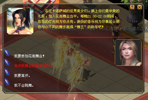 2、每日21:00-22:00期间,让哈奇小镇里的花街舞者阿露缇(185,102)送你进入花街广场,向安琳歌舞教练报名参加花街舞会。