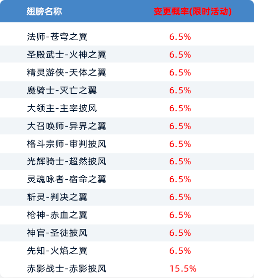 2. 活动内容:4代翅膀职业转换系统,赤色战士4代翅膀变更概率提升。
