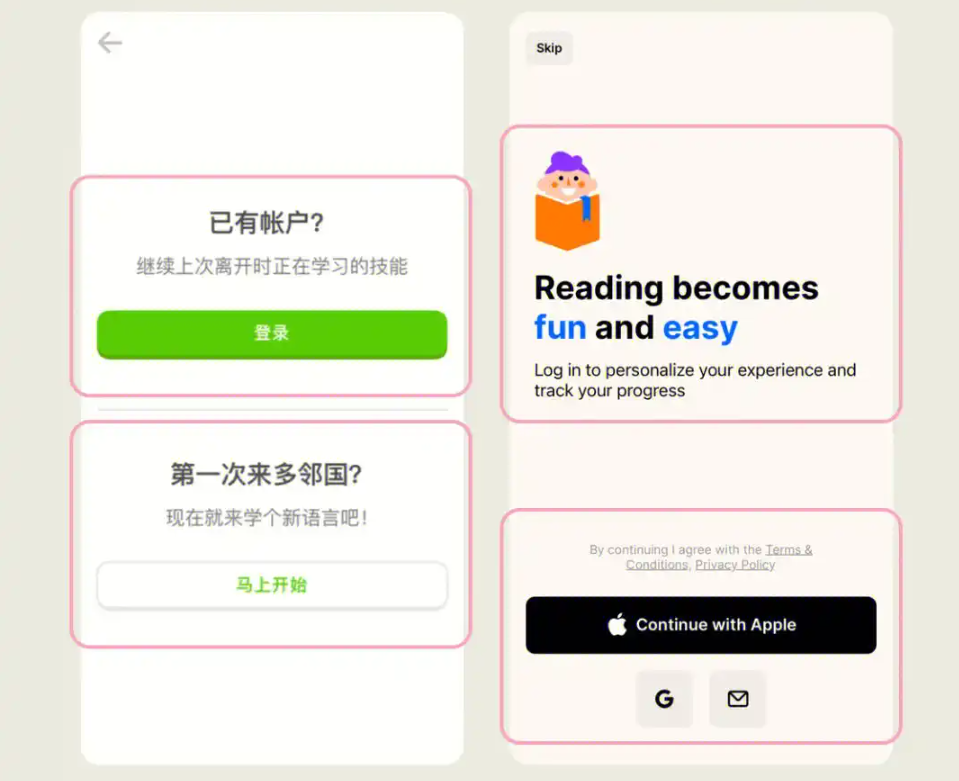 左图-多邻国,右图-Headway,用间距/分割线分出页面模块,关联更强的内容相近,将相似的、有关联的信息尽量摆在一起,不要让用户迷茫要他在潜意识里就知道在哪里能找到自己想要的信息。