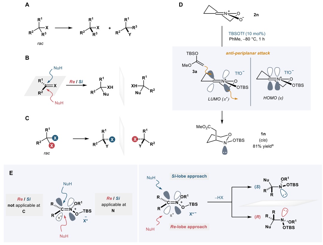 接下来,作者对该反应的立体选择性控制进行了研究。先前的研究已证实在SKA与nitronate 反应中会形成硅基硝鎓离子/IDPi反阴离子对。在该反应中,反应性碳原子及其取代基可明确区分Re和Si面。然而,由于硝鎓离子碳上的取代基相同,尽管相应的氮原子具备Re/Si特征,但无法进行形式上的面区分。因此,需采用新的对映选择性描述方式,并且Izumi和Tai先前提出的对映异构体区分(enantiomer differentiation,图3A)、对映面区分(enantiofacial differentiation,图3B)和对映(位)基团区分(enantio(topic)-group differentiation,图3C)均不适用于本体系。受Ioffe工作的启发,作者合成了未取代环状nitronate 2n并对TBSOTf催化2n与SKA 3a的反应进行了研究,结果表明该反应仅生成cis-1n,符合反式共平面加成路径(图3D)。显然,该机制也适用于非环状nitronates 2的反应。在关键的成键步骤中,电子正式从亲核试剂(硅基保护的烯酮缩醛)的π-HOMO转移至亲电试剂(硝鎓离子)的π*-LUMO,而且该π*轨道具有两个节点,C=N-π体系的同相叶瓣位于相对平面。电子密度向其中一个π*叶瓣转移,这不仅启动新C–C-σ键形成,还导致C=N-π键断裂,并在氮原子另一侧积累电子密度,形成孤对电子。因此,碳上两个π*叶瓣的区分决定了氮的绝对构型,此种独特的对映选择性可定义为“叶瓣对映体区分(enantiolobal differentiation)”(图3E)。
