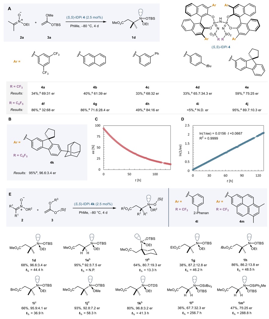 首先,作者以异丙基nitronate(2a)和烯醇硅烷(3a)为模型底物对一系列强酸性、受限的IDPi Brønsted酸催化剂进行筛选(图2A),结果显示带有强吸电子Tf基团的手性Brønsted酸(4a-4e)能以良好的产率和对映选择性得到产物;而当Tf被五氟磺酰基(C6F5SO2)取代时,催化剂4f-4j的对映选择性更高,其中螺芴基取代的催化剂4f效果最好(产率:95%,e.r.值:90:10)。进一步筛选螺芴7位烷基取代基后,发现催化剂4k能以68%的产率和96.6:3.4 e.r.值得到所需胺1d(图2B),并且测得1d的半衰期为44.4 h、活化自由能(ΔG‡,25°C)为25.2 kcal/mol,特别是胺1d的半衰期高于已报道的异头胺1a(图2C-2D),作者推测这可能是由于硅原子的存在或者其空间位阻大所致。其次,作者探索了该反应的底物范围(图2E),结果表明:1)硝基甲烷衍生的nitronate 2e在4h的催化下以95%的产率(¹H NMR)和92.5:7.5 e.r.值得到所需产物1e,但其在25°C下极不稳定,因此无法准确测定半衰期;2)硝基环己烷衍生的nitronate 2f在优化条件下以良好的产率(64%)和中等的对映选择性(80.7:19.3 e.r.)获得胺1f,但其半衰期仅13.3 h,不足1d的三分之一;3)将SKA中的烷基从乙基改为异丁基或苄基(1g-1i)后,均能以中等至良好的对映选择性获得相应产物且半衰期相近;4)将氮上乙氧基换为甲氧基后得到胺1j(产率:93%,e.r.值:92.8:7.2),而且半衰期显著延长(58.3 h);5)在SKA中引入大位阻TDS基团,使用4h催化能以80%的产率和96.8:3.2 e.r.值获得1k;6)将nitronate的R2烷基替换为另一个硅基时,可以36-47%的产率和67.7:32.3 e.r.-75: 25 e.r.值获得产物1l和1m,并且半衰期极长(分别为256.7 h和288.8 h)。