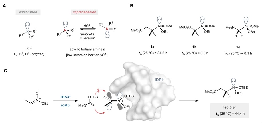 前些天,我们刚刚报道了南方科技大学谭斌教授团队与加州大学洛杉矶分校K. N. Houk教授团队合作发表的一篇Nature文章(Nature, 2025, DOI: 10.1038/s41586-025-09607-6, 点击阅读详细),他们通过不对称有机催化控制三角锥形氮中心手性,并高对映选择性地合成了21个N-立体中心为唯一手性元素的1,2-oxazolidines类化合物。值得一提的是,这是N-手性化合物的首例催化不对称合成。 谈到手性,学过中学化学的人一般会想起四面体碳中心及其相关结构的手性分子。目前,基于碳中心的立体化学已得到广泛而深入的研究,但是三角锥形手性分子的研究仍相对不足,目前常见的化学合成仅限于P-手性磷化氢、S-手性亚砜和锍盐等少数体系(图1A)。2023年,Martin D. Smith等人首次报道了桥联、螺旋手性氧鎓离子的不对称合成(Nature, 2023, 615, 430, 点击阅读详细)。相比之下,当手性中心是氮原子时,合成就会变得非常具有挑战性,特别是对于开链胺来说。N-手性叔胺在室温条件下构型不稳定,通常需要通过桥联或季铵化形成相应的四面体铵离子以防止“伞形翻转”引起的外消旋化。近几十年来,化学家在含或不含其它手性元素的N-手性环胺合成方面已取得显著进展,但目前尚未稳定无环N-手性胺的不对称合成案例见诸报道。早在1890年,Hantzsch和Werner等人就预测三价手性胺可能具有光学活性,但后续分离获取均未成功。随后,Meisenheimer等人指出由于手性胺存在快速锥形反转,因此难以拆分。进一步研究发现在氮原子上引入强电负性和Lewis碱性取代基(如氧原子)会显著提高锥形手性分子的翻转能垒。事实上,Kostyanovsk等人早在1980年已成功分离出差向异构胺1a和1b(图1B),并测定其反转能垒与半衰期。 2021年,德国马克斯•普朗克煤炭研究所Benjamin List教授课题组报道了IDPi催化硅基保护的烯酮缩醛(SKA)与原位生成的双硅基硝鎓离子(bis-silylnitronium ions)的不对称加成反应(Nat. Catal., 2021, 4, 1043,点击阅读详细),并成功构建了一系列有价值的脂肪族β3-氨基酸中间体。在此基础上,Benjamin List教授与同事Chandra Kanta De博士等人利用IDPi催化烯醇硅烷与硝鎓离子的不对称加成策略,对映选择性地合成了一系列稳定的无环N-手性胺(图1C)。在所得的无环N-手性胺中,两个N-氧取代基抑制了氮翻转,从而显著减缓异构化。此外,本工作不仅实现了N-手性中心的有效构建,也为深入探索尚未充分开发的手性差向异构胺的化学性质提供了新途径。相关成果发表在Nature 上。