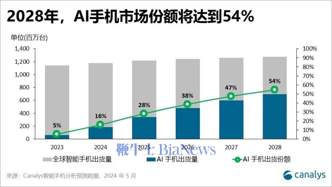 但在智能体时代,AI与硬件深度融合被视为下一个“iPhone时刻”。据canalys预测,到2028年,全球AI手机占智能手机出货量的比例将增长到54%,未来手机可能不再需要用户点开一个个App,而是通过智能体直接获取结果。