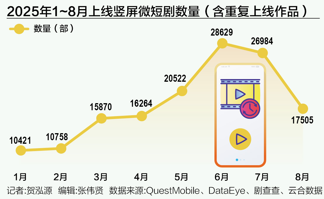 中国网络视听协会数据显示,2025年1-8月,短视频平台、小程序和微短剧应用共上线竖屏剧14余万部,这一数量的急速增长主要缘自部分剧集的重新剪辑、复投上线,若去掉该部分内容,结合行业调研及综合评估, 预计2025年全年独立完整制作并上线的竖屏剧数量约为4万部。