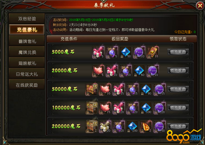 活动说明:活动期间,每日累计充值达到指定魔石数量,即可领取超值豪华大礼